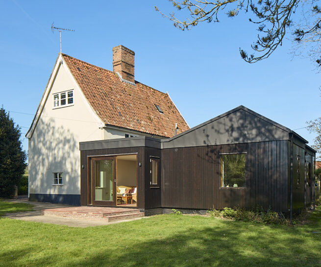Demolish tired extension, brace rear cottage wall, construct timber framed extension with Critall windows, modify and clad garage, landscaping.