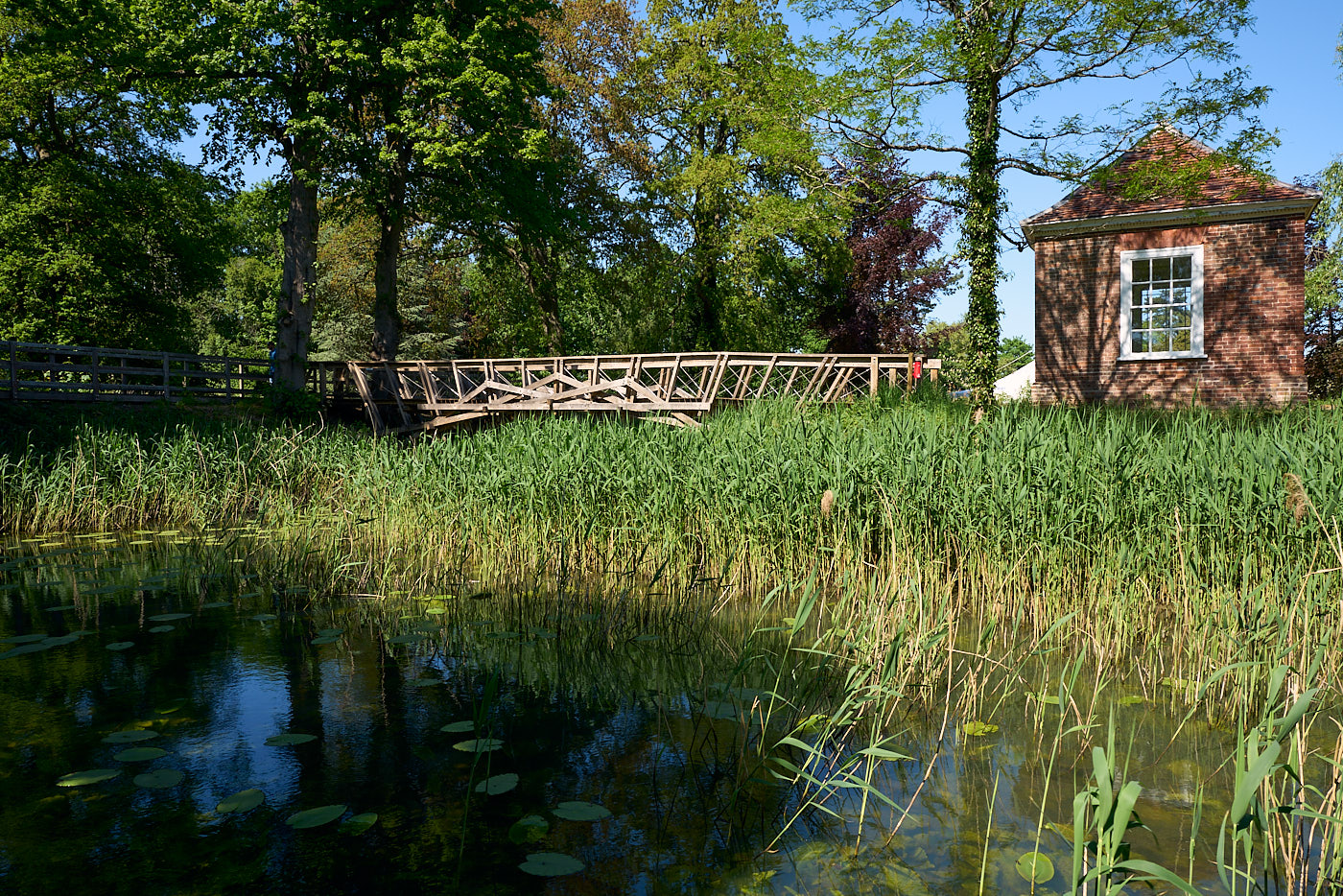 Working to a concept by Jon Pattle and design by Modece Architects our joiners first built the bridge back at our yard in Marlesford before we transported it to the fishing lake at the museum for installation. The arched design of the bridge meant that it was easier to first build it upside down so we only got to see it the right way up when it was set in the concrete piers we had prepared at site. The footbridge now gives public access to the island and fishing lodge previously unavailable to museum visitors.