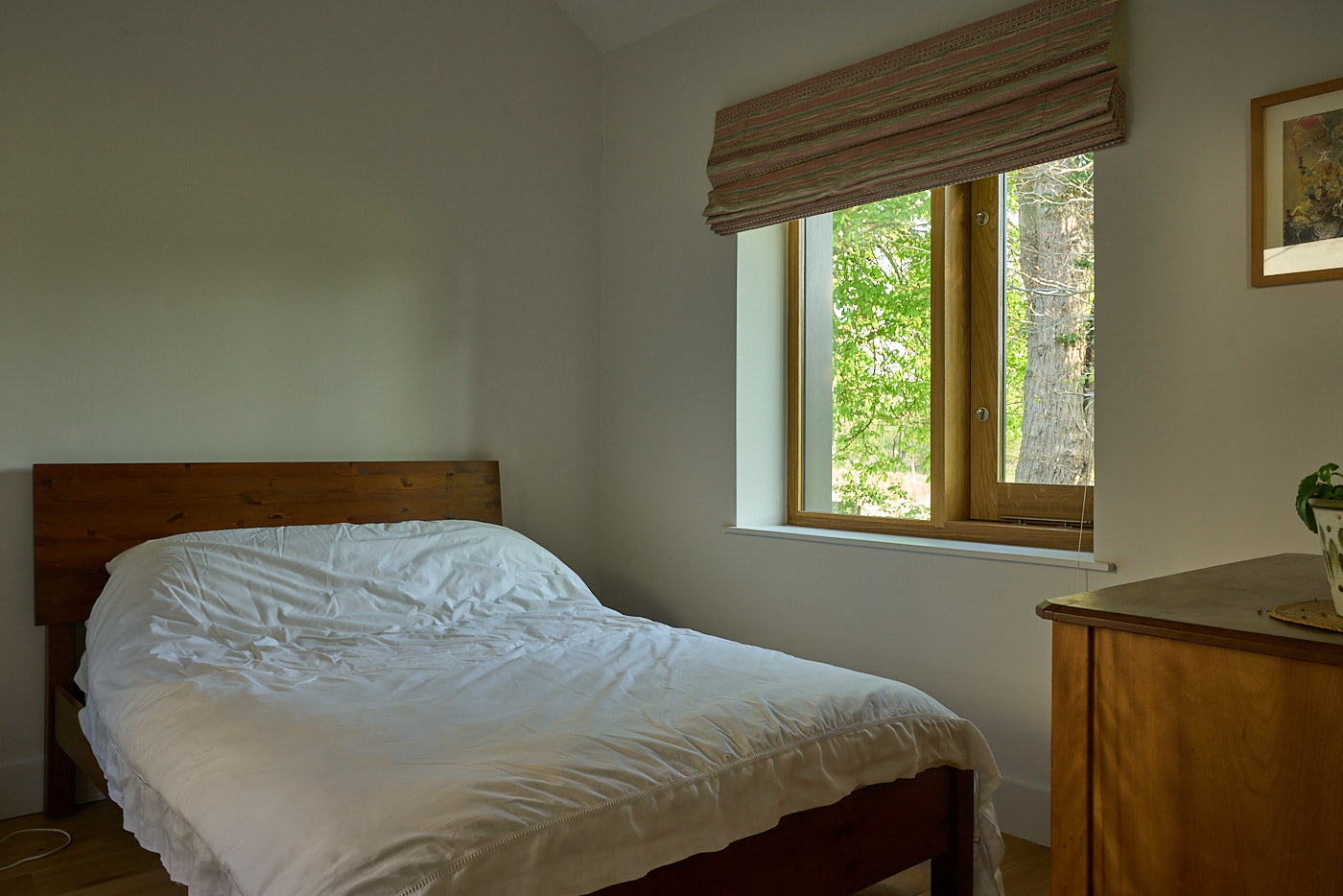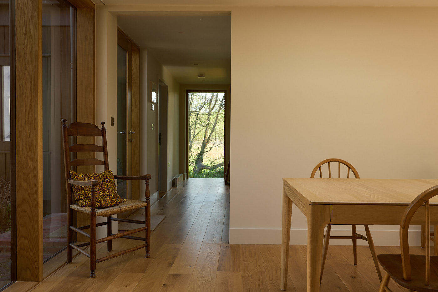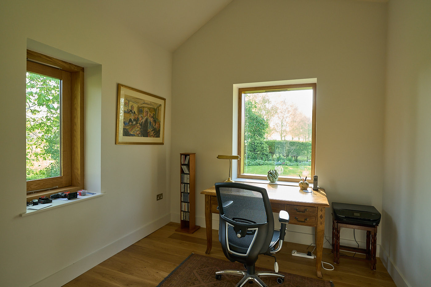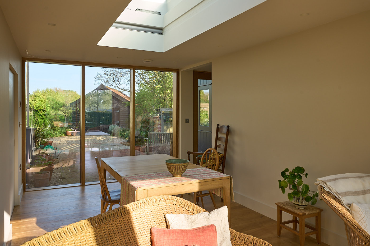We fitted bespoke timber doors and windows and beautiful engineered timber floors with underfloor heating to complement the traditional country character of the original building whilst allowing it to exceed modern environmental standards. We timber clad and re-insulated all walls and installed a complex zinc roof with hidden guttering. Three discrete sliding doors allow the spaces to be opened up or snugged down as desired.