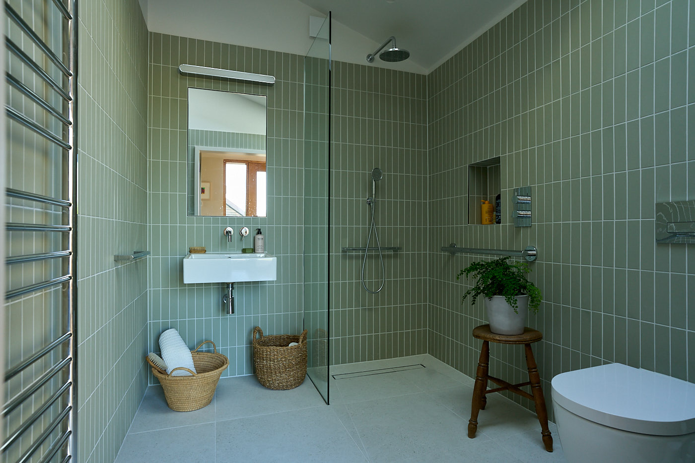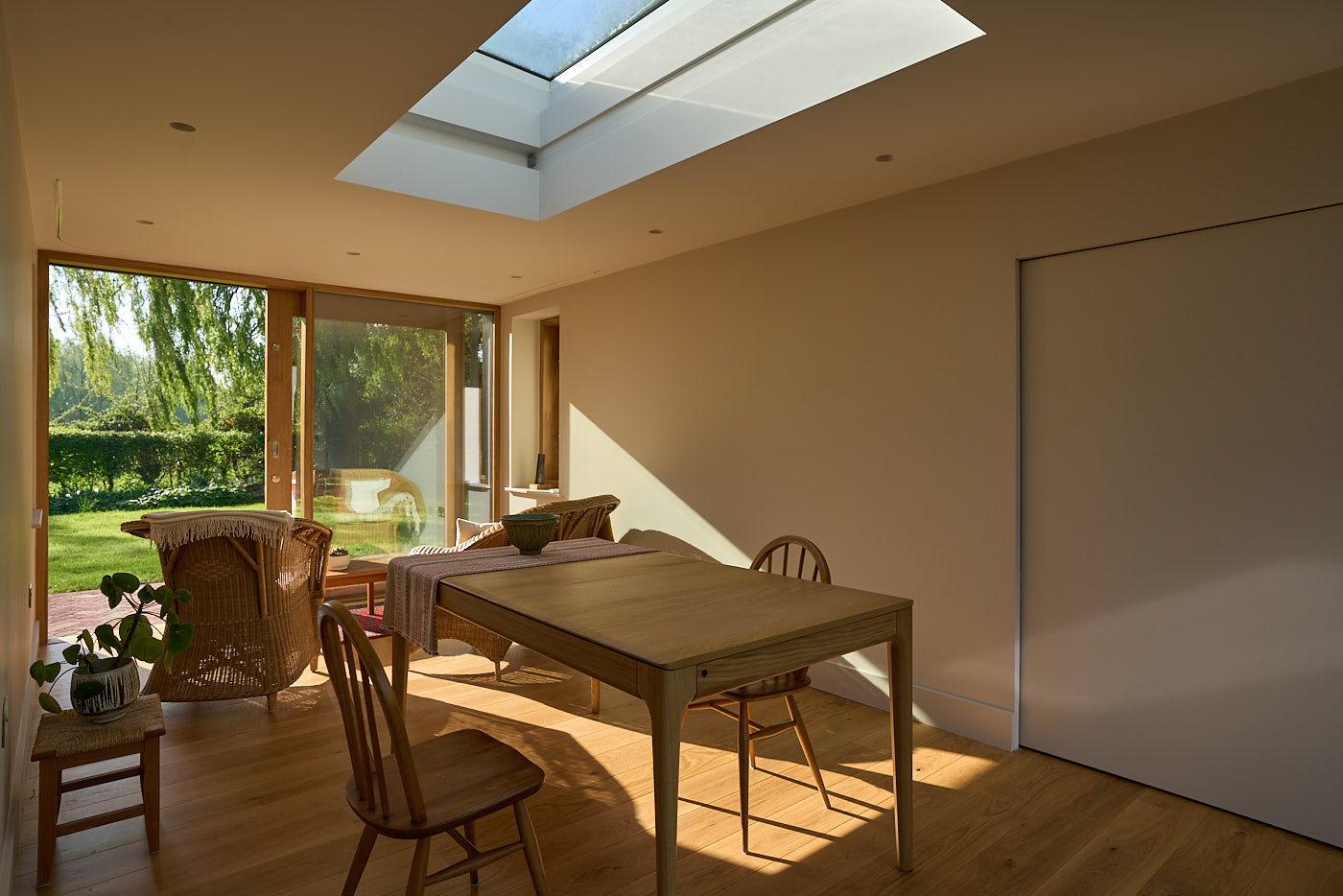 Where a previously awkward layout required access through a conservatory with changes of levels to two bedrooms and an outdated bathroom we were able to create a free flowing space with wide doors and level access throughout and provide a spacious modern bathroom and attractive dining area with a strong connection to the garden.